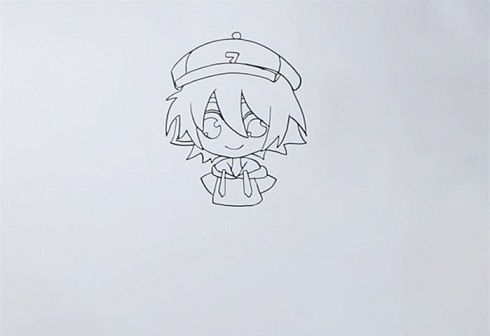 2、再来画出金的五官,眼睛大大的,嘴巴微笑着,画出金的上半身,注意画出帽子的细节。
