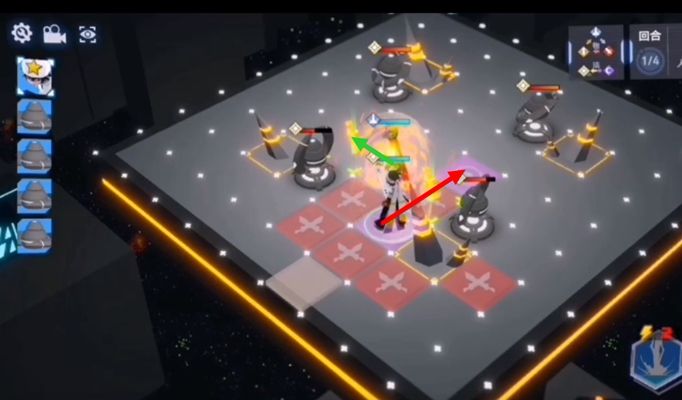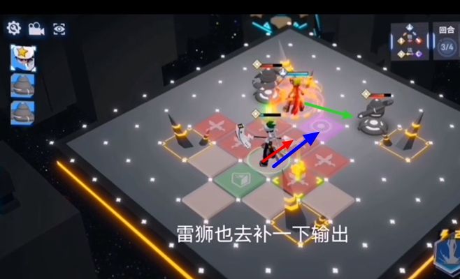 4、雷狮上前一格帮助卡米尔输出,然后卡米尔卡2技能加工然后回点血,攻击下方的小怪。然后雷狮走到紫色格子上一波把两个小怪带走。
