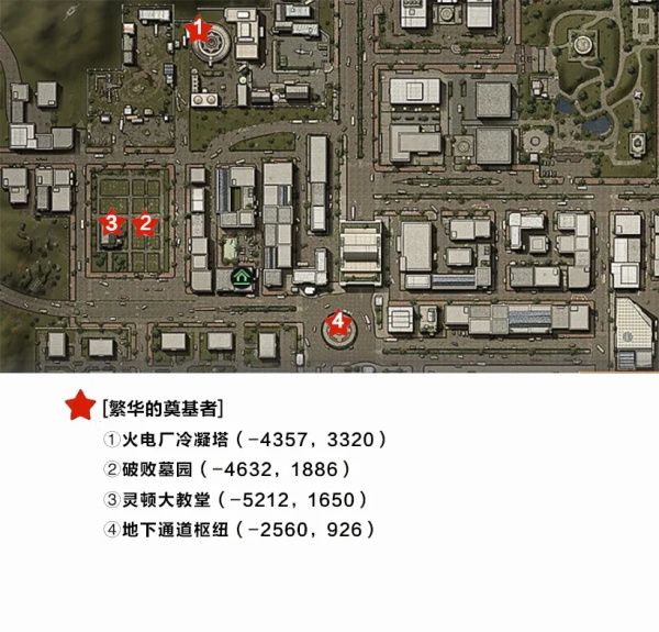 火电厂冷凝塔 (-4357,3320)、破败墓园 (-4632,1886)、灵顿大教堂 (-5212,1650)、地下通道枢纽 (-2560,926)