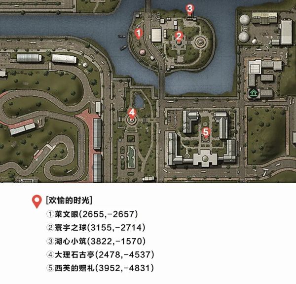 莱文眼 (2655,-2657)、寰宇之球 (3155,-2714)、湖心小筑 (3822,-1570)、大理石古亭 (2478,-4537)、西芙的赠礼 (3952,-4831)