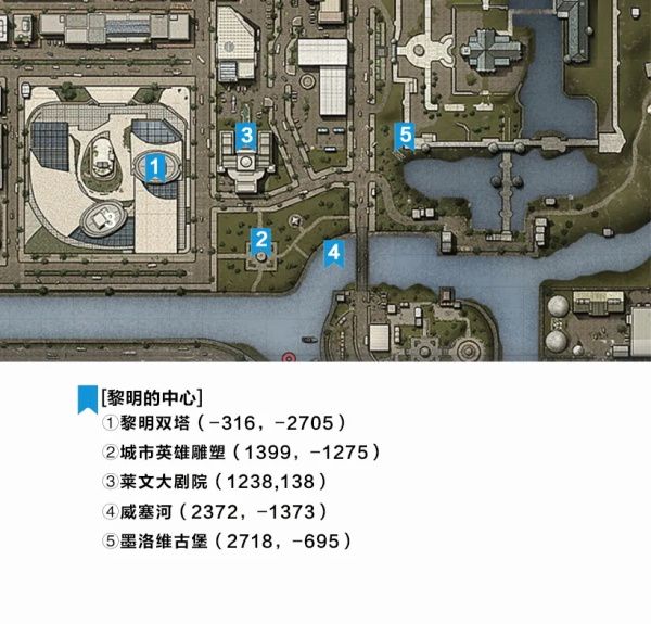 黎明双塔 (-316,-2705)、城市英雄雕塑 (1399,-1275)、莱文大剧院 (1238,138)、威塞河 (2372,-1373)、墨洛维古堡 (2718,-695)