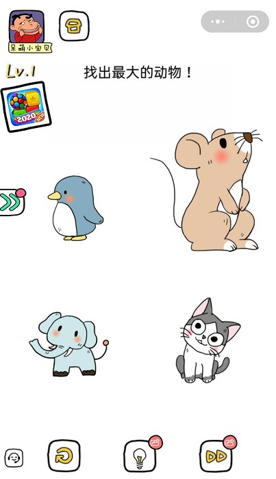 第一关是要找出最大的动物,不要从视觉上的感官去判断,最大的并不是老鼠,在生活中最大的动物是大象,点击大象即可通关。