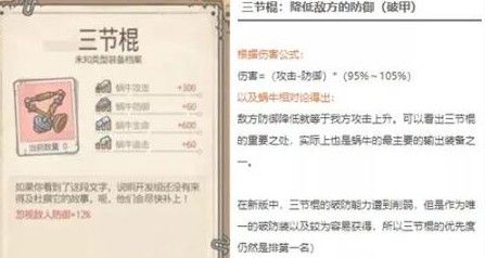 三节棍是当前版本最强力的武器,因为有着独一无二的破防效果,无视的是百分比防御,可以大幅提升输出伤害。这也是打死乌龟获得的唯一奖励,拿3根香+10万黑蝌蚪获取,绝对是血赚不亏的。