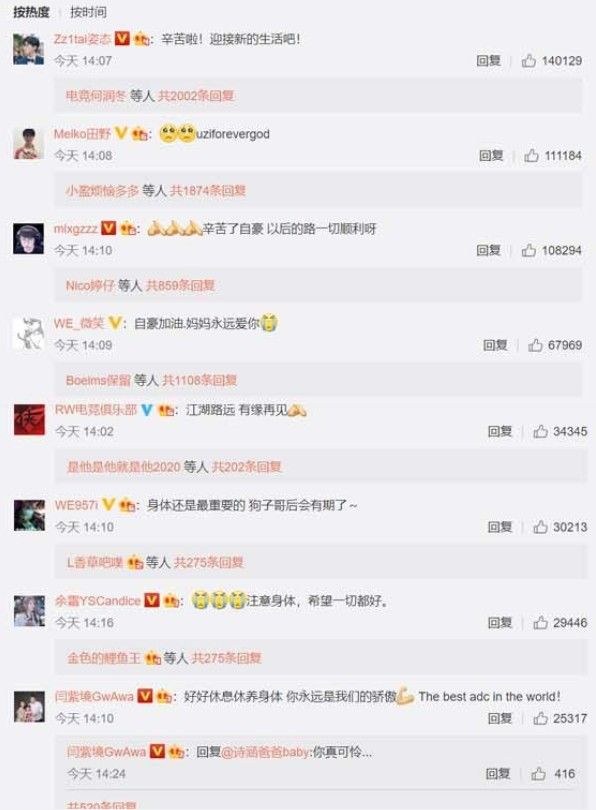 在RNG战队官博宣布Uzi退役声明的评论中,则是LPL数家俱乐部送上了对于Uzi的祝福,包括EDG、TES、BLG、VG、FPX、DMO、OMG、iG在内的多家俱乐部都祝愿Uzi未来一切顺利,而LCK赛区T1战队官博也评论称和Uzi“就此别过,恭祝Uzi未来乘风破浪,前程似锦。”