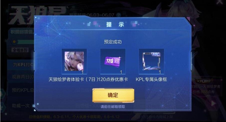 这次只是预订皮肤,和上一次东皇太一逐梦之光是一样的,预订之后就可以抢先体验皮肤了,会送给你天狼绘梦者7日体验券,再加上120点券优惠卡,并且还能获得KPL专属头像框,活动内容真的超值啊!
