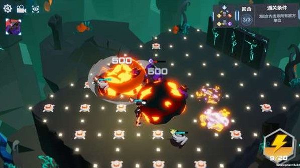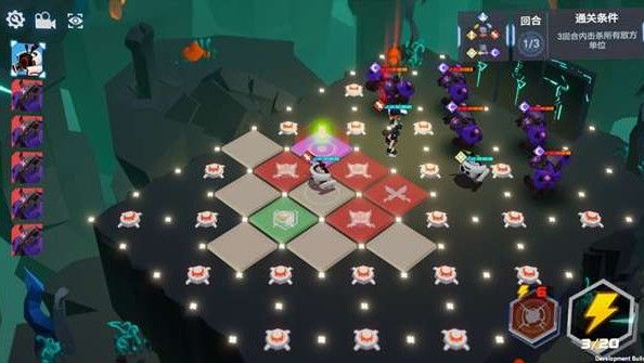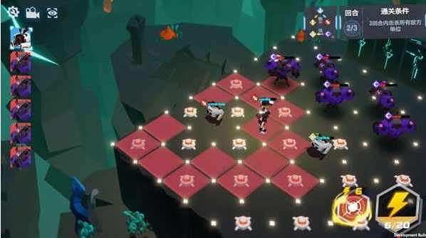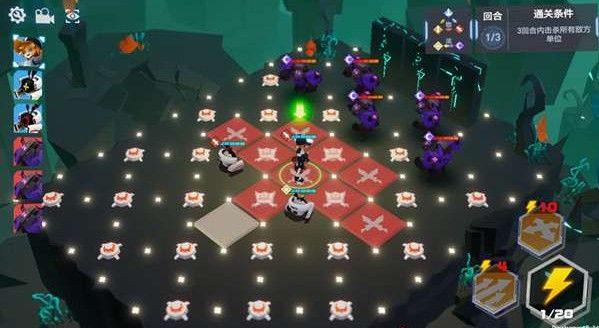 以关卡1-6为例,进入战斗后,我们看到场地上有很多爆炸物,我们要做的就是在三回合内,利用爆炸物来解决敌人。但是如果我们一直后退的话,每个敌人踩到两个爆炸物之后的血量都刚好剩下一点点生命值,所以我们要做的就是在后退诱敌深入的同时,保证每个敌人都受到一次攻击~