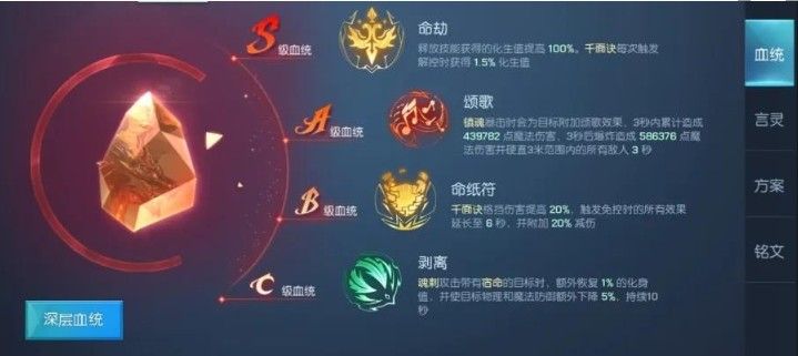 破军有20%的几率触发镇魂,镇魂触发颂歌血统可以造成两倍于破军的伤害,在化生持续期间魂刺由于宿命的存在可以无冷却释放,达成快速刷新破军的效果,使触发频率提高,大幅度增加自身伤害的同时对对方造成强力控制效果。