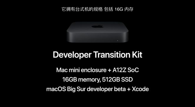 同时,为了协助开发者将其应用从英特尔处理器转换到自研处理器上,苹果发布了一款特别版的硬件Mac mini——Developer Transition Kit。