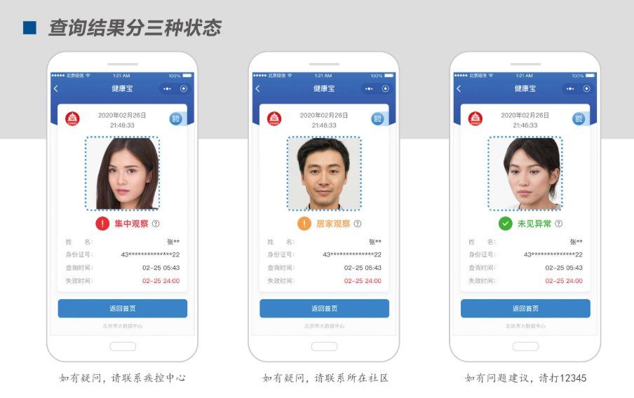 北京“健康宝”依托来自于卫生疾控、社区等部门的疫情相关数据,按照相关防控规则经数据比对后得出,实行动态管理。红、黄、绿三种状态之间会随着疫情数据的丰富和疫情发展变化同步更新。例如集中隔离解除后,红色会变成黄色;居家隔离解除后,由工作人员进行人员状态更新登记,黄色会变为绿色。