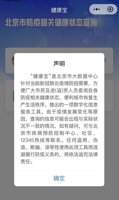 具体来说,您可以打开微信、支付宝,搜索“北京健康宝”小程序,仅需在首次使用时输入姓名、身份证号,并进行智能认证,即可查询自身健康状态,