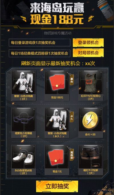 2.玩家每日登录游戏可获得1次抽奖机会,每日完成1局经典模式四排获得1次抽奖机会(不包含娱乐模式和第一人称),活动期间最多可获得14次抽奖机会