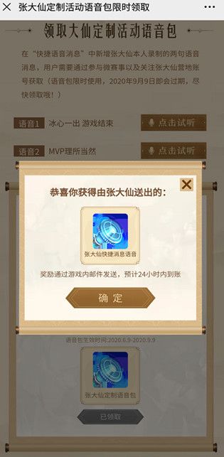 本次第二季虎牙大仙杯的报名时间是6月9日到22日,在此期间报名并前往王者营地关注大仙就能拿到定制语音。而这个由大仙本人原声录制的语音包只是用于鼓励玩家们积极报名参赛的,在赛事之中还有专门的奖励会提供。