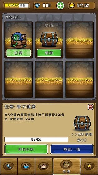 点击任务图标,可以根据自己的能力选择是否接取当前任务,完成任务后可以获得宝箱,开启宝箱可以获得新队员,技能点以及黄金。