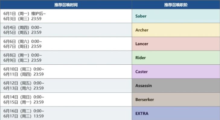 「职阶区别推荐召唤(每日替换)」为确定职阶的每日替换卡池,只有属于推荐召唤职阶的从者才可被召唤。