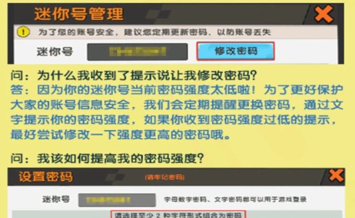 为了更好地保护大家的账号信息安全,新版本还会定期提醒玩家更换密码。版本更新后可在迷你号管理界面新增修改密码按钮,想要修改密码的点击即可。