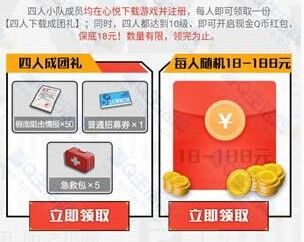 四人小队成员均在心悦下载游戏并注册,每日即可领取一份四人下载成团礼。