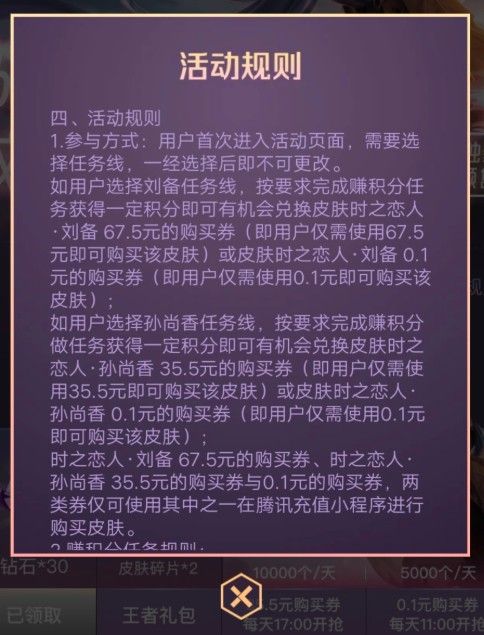 玩家通过做任务就能获得积分,有了积分就能参与活动了,200分就能兑换钻石x30、1000分兑换英雄碎片x1+皮肤碎片x2、8000分就能抢67.5元的时之恋人刘备(每天17点开始抢,每天只有10000个每天)、14000分就能0.1元抢时之恋人刘备(每天11点,5000个每天)