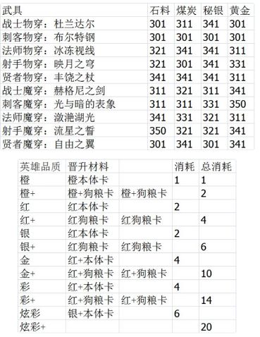 下面附上武具制作公式和英雄晋升的简图,武具公式是橙+,红的加50,红+的加100,以此类推: