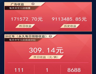 分红车是此游戏的广告收益分红凭证,拥有分红车的用户每天都可以获得分红。可通过个人持续努力,必定获得。49级车升级50级时概率产出。每天中午12点,平台会根据昨天的部分广告收益和全网分红车数量,计算出昨日广告分红情况。一辆分红车预估可获得300元一天的广告分红。