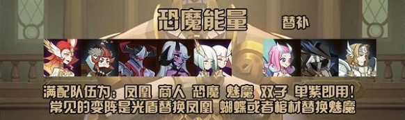满配队伍为:凤凰 商人 恐魔 魅魔 双子。