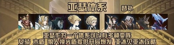 亚瑟作为一个体系可以有多种变阵常见的有:亚瑟龙弓流,打平A速攻。亚瑟冰魔流,打多段控制。亚龙变阵有各种搭配主要是女骑 木盾 狼人。