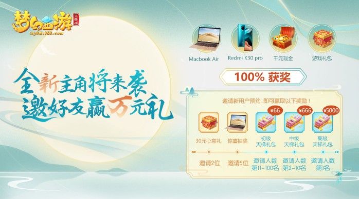 新角色新门派的加入,三界势力都将为之震动。风云际会,正是扬名之时,如果少侠有所期待,不妨拉上好友一起预约新角色,只要邀请好友加入三界,100%中奖:邀请2位新朋友,即可获取价值30元的游戏礼包;邀请5位新朋友,即可参与Macbook Air、Redmi K30 Pro、666现金或价值80元的游戏礼包中抽奖。同时,如果邀请新朋友数若位居前100名,还能额外得到最高5000元的现金加码福利!是时候展现真正的人气了~