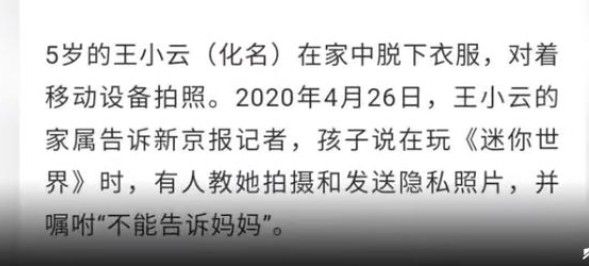 具体的原因在于,有不法分子诱导5岁等小朋友拍下不好的照片。5岁的王小云就是玩迷你世界的时候被妈妈发现准备拍照!