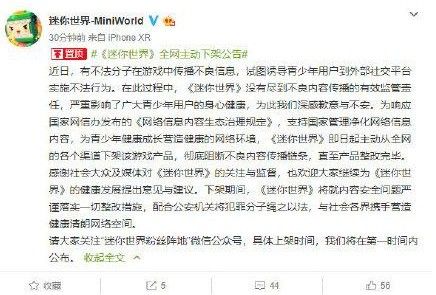 就在4月28日凌晨晚间,迷你世界官博发布两条公告,称将游戏全网主动下架,启动最高等级内容监管限制。