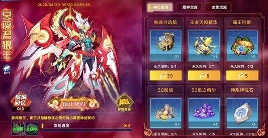 活动内容:在太初攻略战中挑战关卡,获得遗迹中存留的力量,即可唤醒冥夜君狼王的狼夜之灵,解锁冥夜君狼王的契约/进化/突破;更能兑换大量珍稀道具;而创世三族所留下的神秘壁画的秘密也会在太初宝库中等你揭晓!