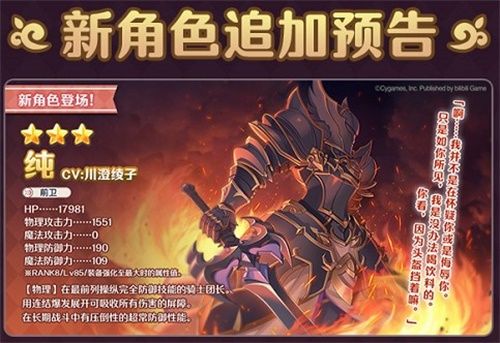首张限定人权卡,错过再等半年时间。因为是限定角色,所以到下一次开放碎片获取需要半年时间。纯是一个前排肉盾,因为身穿黑色骑士铠甲而被称为黑骑士,其实是一个女团长,玩家可以在她的故事章节里面了解过往。