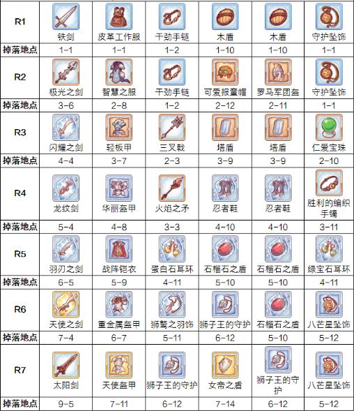 这个表格收集了黑骑从R1到R7所需的装备,由于R8装备目前尚未出完,因此建议各位还是先把黑骑装备卡在R7就好。
