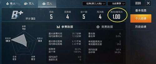 然后在右边,可以看到一个淘汰/被淘汰,这个就是代表你的战绩,如图所示,本人的战绩是1.5,说明是一个菜鸟,在游戏中死了十次,但是总共就是击杀了15个人,所以算是1.5的KD,属于比较差的水平了。