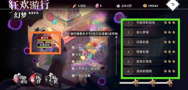 图中用绿框标注的即为普通活动关,必掉梦幻里程点、蓝 蛋,概率掉落红蛋。用黄框标注的是BOSS关,必掉梦幻里程点,蓝蛋,金蛋。