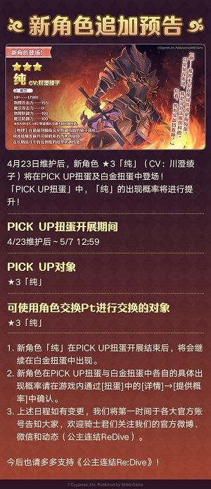 维护完成后将追加全新角色★3纯(CV:川澄绫子)、实装天井功能,同时开启一系列限时活动。