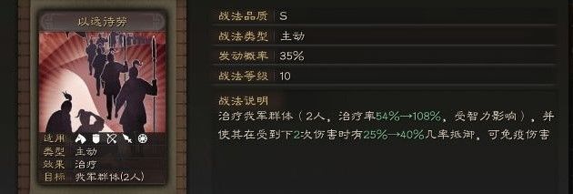 战法分析:这个战法一旦发动是极其强大的,首先治疗率和坐守孤城就差不多,然后40%概率的护盾虽然看脸,但是万一抵消了伤害那就非常好了。尤其是现在玩家普遍前几回合伤害非常高,如果你抵御了一次所向披靡,万箭齐发这样的伤害,那比加血量都要多。