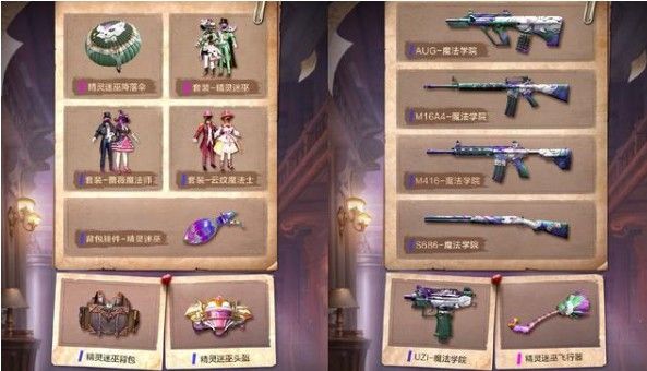 套装有3款,除了上面提到的顶级套装“精灵迷巫”之外,还有两款套装是蔷薇魔法师、云纹魔法士。枪皮包括M416、S686、M16A4、AUG、UZI这5款。
