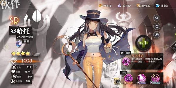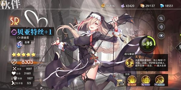 抖m修女,sr卡,收集难度中等,同潘,4星能用,5星更好。7个职业,有3个能给她加攻击和生命,而且是敌方加友方都可以。十字攻击百分百不会打歪,百分比330%还和列,排职业一样高还有30%的晕,经常能给潘和小夜创造输出环境。升级,装备优先度和小夜并列。