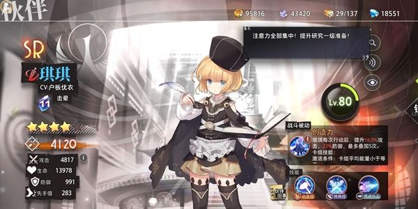 琪琪,sr卡,收集难度低,要一张2星就可以了,凑队长buff用,给14以下伙伴加攻,我这配置基本都是低费人物,性价比还是可以的,没必要出了东文就换了她,不升星也是可以的,毕竟我们是平民玩家,粉尘也很重要的。