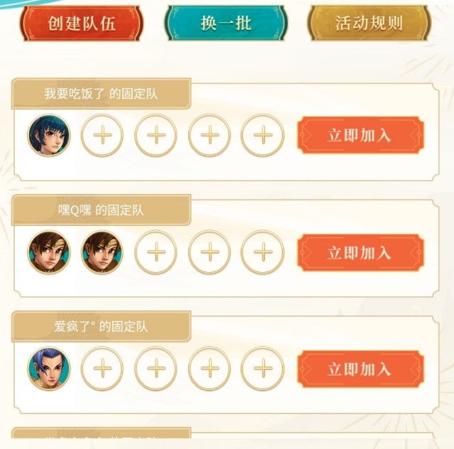 对于不想自己创建队伍,同时也不会加入好友队伍的道友,可以选择加入公开招募队伍。页面每次随机展示最多10个队伍,若当前没有心仪的队伍,可以点击【换一批】刷新公开招募队伍列表。