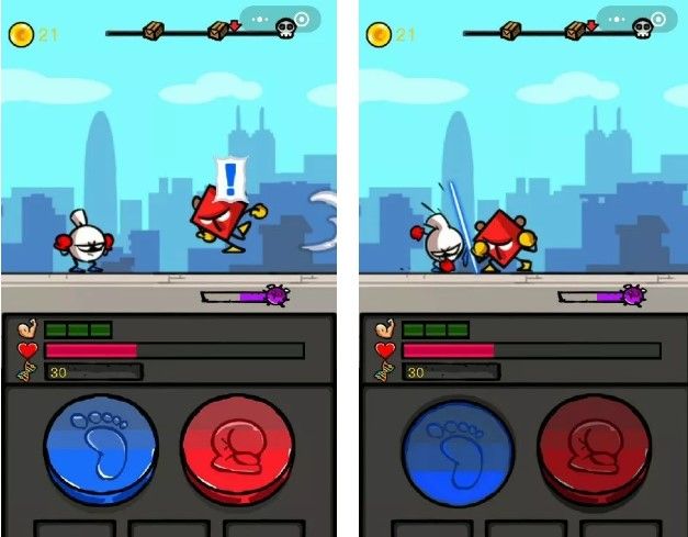 以下图为例:当出现蓝色感叹号提示时,迅速点击蓝色按钮可以防御敌人的攻击。