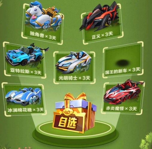 分别是:独角兽、正义、亚特拉斯、光明骑士、国王的新车、冰澜棉花糖、赤炎魔怪,有道具车也有竞速车。