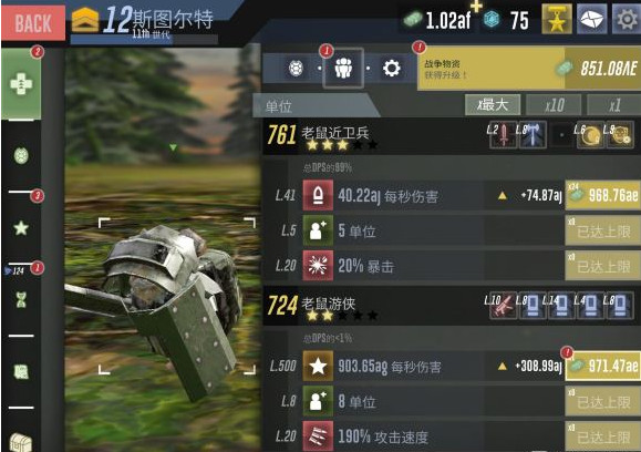 话不多说,进游戏优先升级满老鼠矿工,老鼠矿工最高可升级至1000级3单位(我也不明白为啥我这个能到1002),最高每次获取10.31ae金钱(三个单位合计收入)。