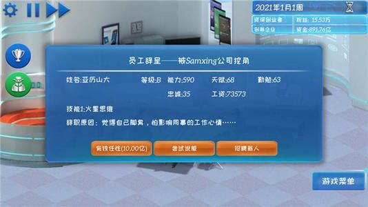 2、在人才市场中可以对员工进行招聘,其中C级员工可以直接招聘,B级有一定概率触发说服系统,A级和S级必须说服她。如果你发现了优秀人才,又对自己的说服技巧没信心,可以去“资本市场”买对应等级的道具书;