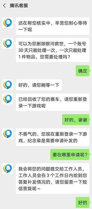 在排队等到人工客服之后很快就可以进行银河救世车的退回,客服会先把玩家车库里的银河救世删掉,之后会进行纪念章的返还申报,在几天之内就会把纪念章补发回到玩家的账号上。