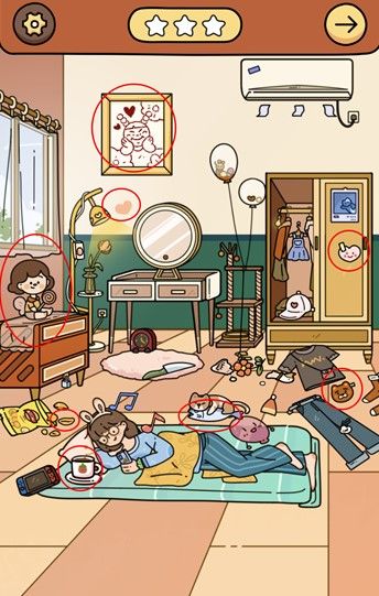 8.点开衣柜里的衣服,将衣服穿在小女孩身上,再点击衣柜里的鸭舌帽,用钥匙打开左边的柜子,将奶嘴套在小女孩头上,最后移动躺着女生口袋里的棒棒糖给小女孩