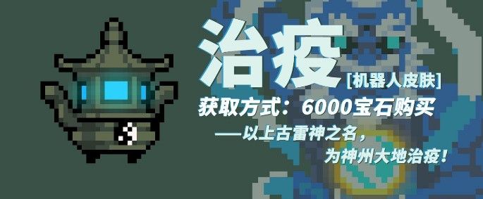 机器人的治疫皮肤,同样花费6000宝石可以入手,皮肤的外形上像是一个炼丹炉,上面还有一个太极八卦的图形,和驱邪皮肤一样,不过颜色有所区别,代表着可以救治疫情,在雷神现世之后拥有祛除病疫的功能。
