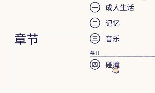 这一章主要是男女主角碰撞遇见时发生的一些事情,女主角和男主角的身影要互相对称才可以,玩家在操作的时候会发生很多有趣的变化,心境自然也会随之改变。自从遇到一个心动的人之后,往后在整个世界,眼中也只能看到他,多调节几次标尺让男女主角可以碰面,之后就可以成功开启约会了。第四章碰撞的玩法其实非常简单,只是看个人的调节和角度观察分析。