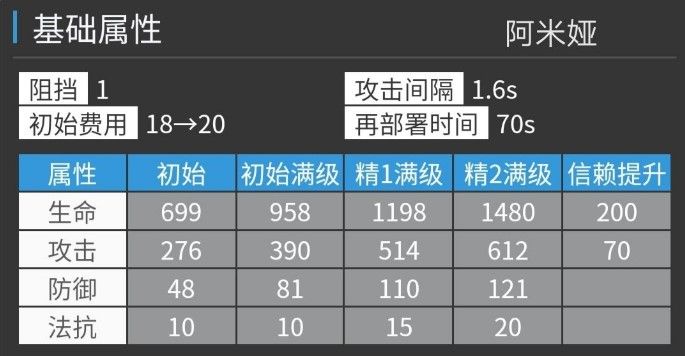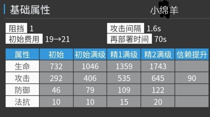 首先是血量,血量精二满级加满信赖共1680,虽然说在整个方舟中不算高,但是在狙击和术士中已经算不错了