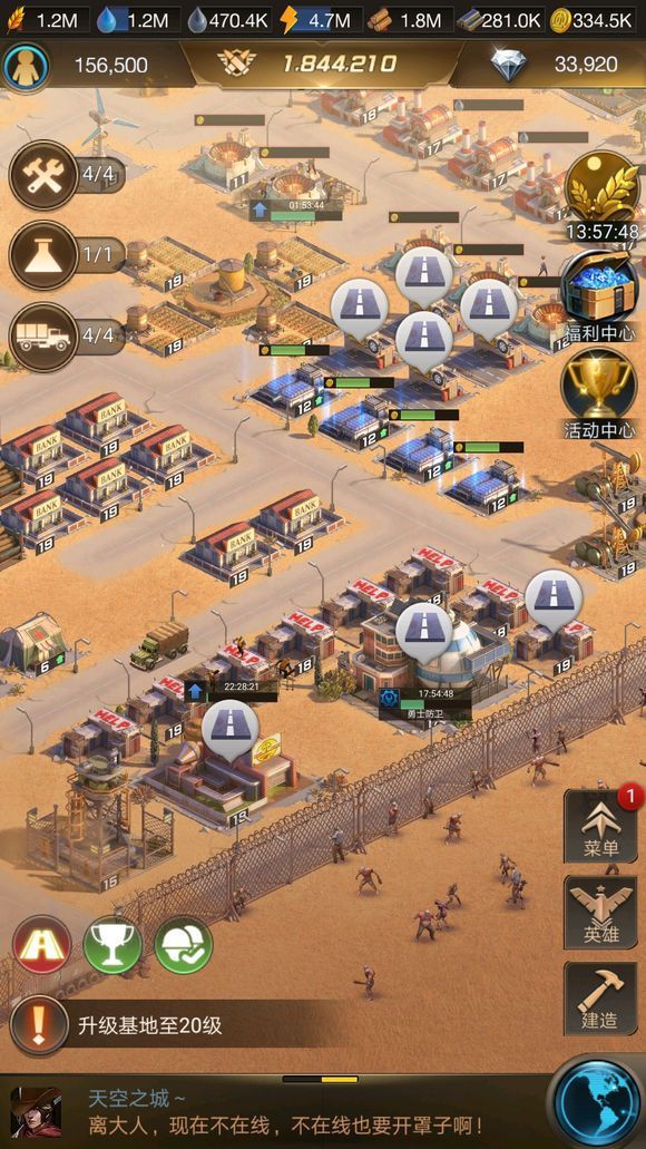 1各种矿(1.1k/h),2民居(试都不要试),3银行,4急救帐篷(断电后有伤兵就会死掉,0.2k/h),5哨塔(断电后不守城,3.1k/h)
