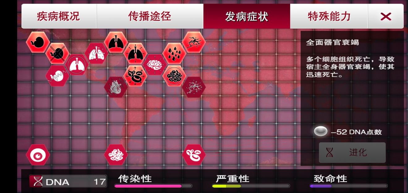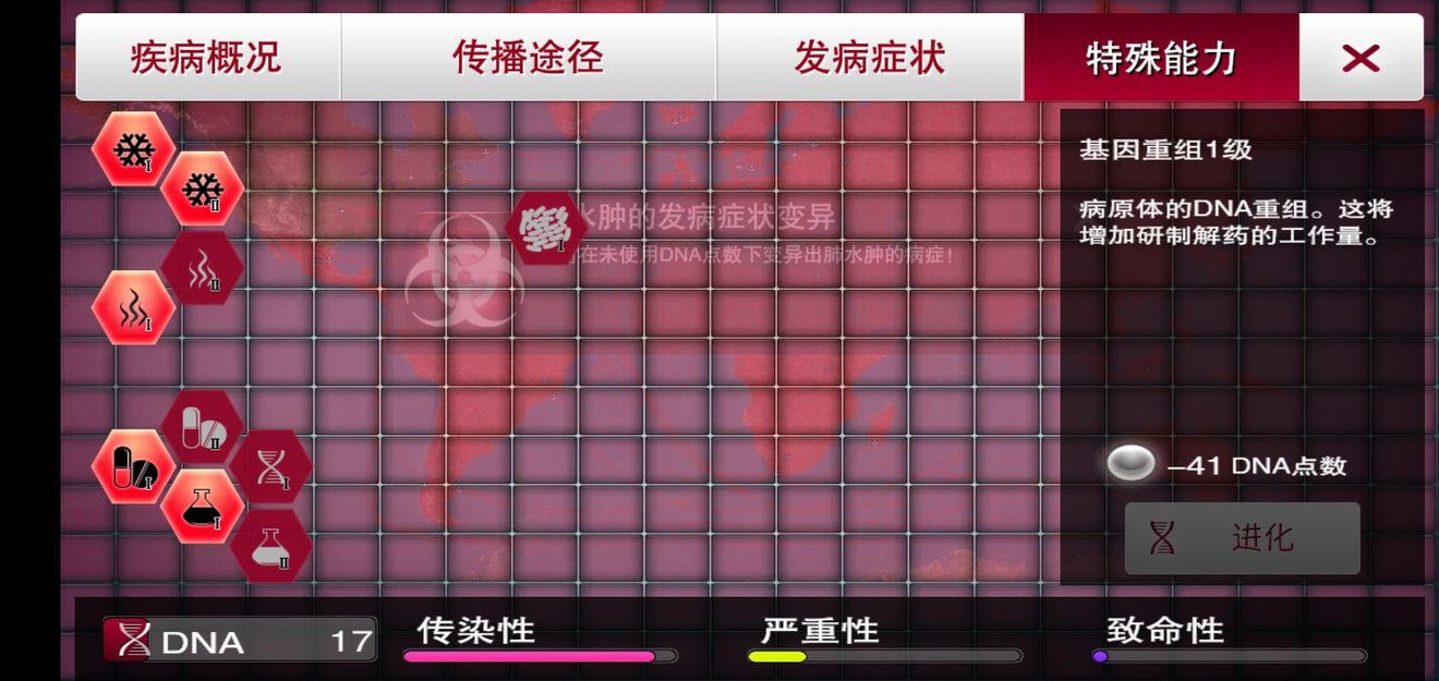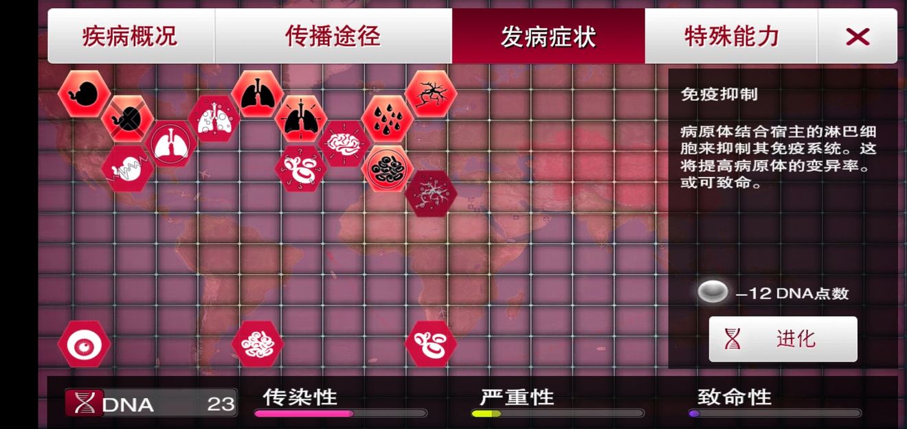 如果有静态症状基因,需要的加点明显减少,可以大大减少难度,用脚过都可以,不过也会受漂变影响,所以要一边杀一边传,该点的在感染人数起来之前点 (2)严重性越高,获得的点数越多,没有一定的严重性,后期点数根本不够用